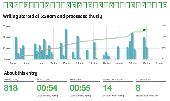 What it does do is track your word count so you're sure to write 750 words (about three pages of writing). Plus, it's gamified, which makes it kind of fun: You get a point for writing anything at all, two points for writing 750 words or more, and more points if you write consistently. And every time you write, it'll give you some cool statistics on how much time you spent writing, the feelings and themes of your words, and so on.