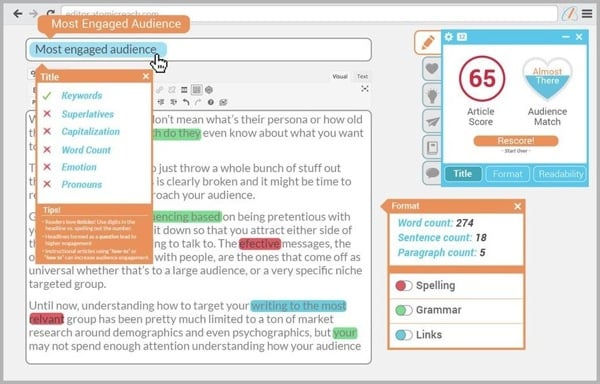 Here's another tool that'll assess your writing -- but this time, it'll assess it depending on your specific target audience's reading level and which content they relate to the most. After all, writing for your target audience is an important part of content marketing.How? Simply hook up your Google Analytics and social media accounts to AtomicWriter, and then paste your content into the app. It'll analyze your historical data and engagement data from those accounts, and then tell you whether it's suitable for your target audience.