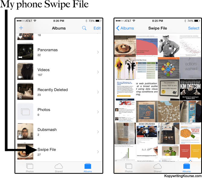 - A digital swipe on your mobile device is good for all the stuff you see when browsing the internet on your phone or tablet. The author of the post, for instance, created a specific folder in his iPhone and made a Phone Swipe File there. He stores screenshots when he sees something on mobile that grabs his attention.