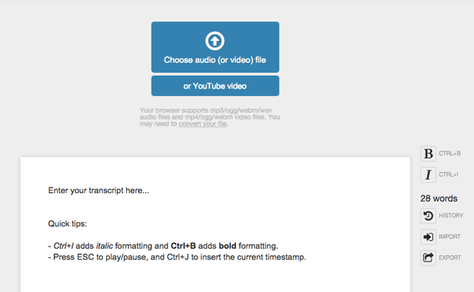 There are a lot of transcription tools out there, but this one is one of my favorites. It's a web app for transcribing interviews created by Elliott Bentley, a graphics writer at Wall Street Journal. The audio player is integrated with the editor meaning you won't have to click back and forth. You can pause, play, rewind, and fast-forward using keyboard shortcuts. Every second, it automatically saves the transcription to your browser's storage. You can export it to plain text or Google Docs. Finally, it's open source under the MIT license.