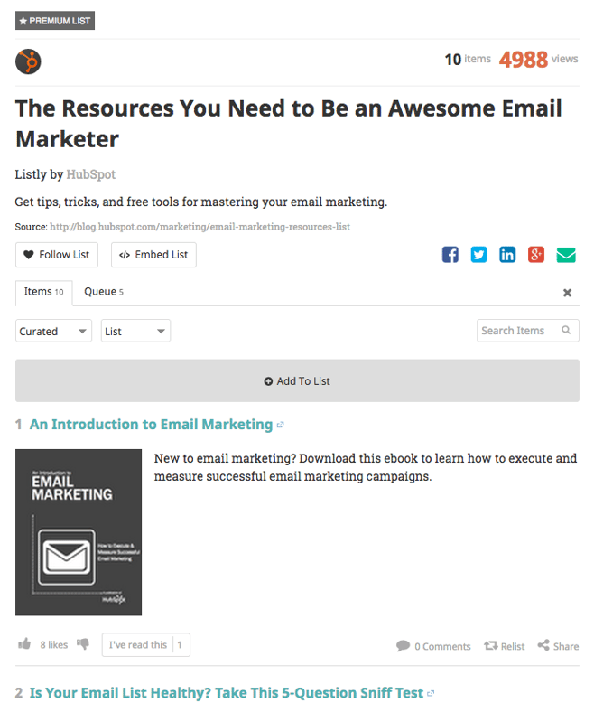 When you're creating list posts -- like this one -- it's easy to hit a wall. Sure, you know there are other great examples out there, but you've already exhausted the ones you know of. With Listly, you can invite your audience to contribute to your list. The Listly community can then vote on list items to move them up the list.You can either embed the interactive list in your post or use it do conduct research before you publish to ensure that the examples, items, or tips you're including are the best of the best.